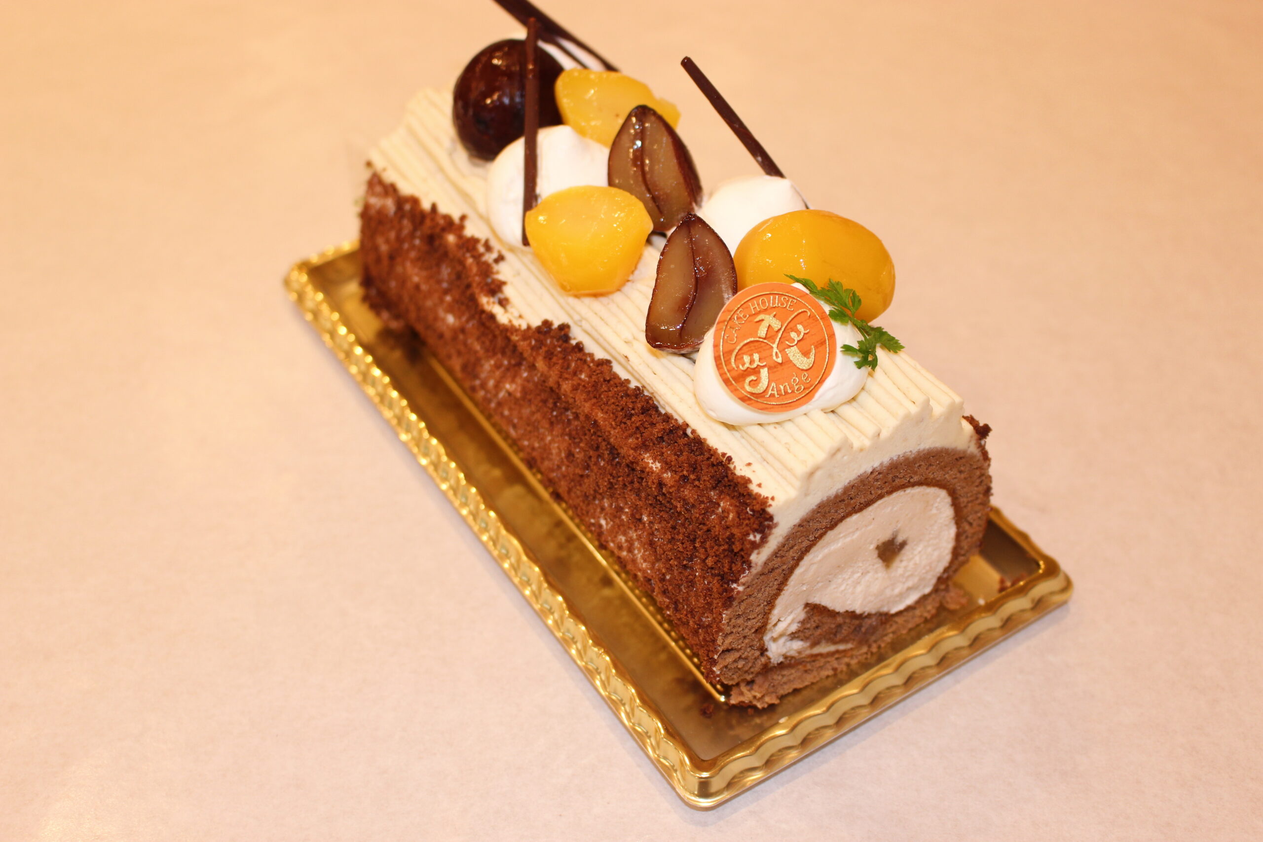 チョコのスポンジで栗のクリームとマロングラッセを巻いたロールケーキです。